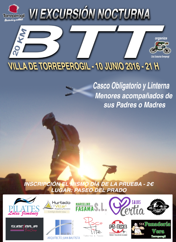 CARTEL NOCTURNA BTTUn año más el CC Torreperogil ha organizado la tradicional EXCURSIÓN NOCTURNA BTT donde cientos de deportistas participan en los 20 kilómetros que transcurren por Torreperogil.
